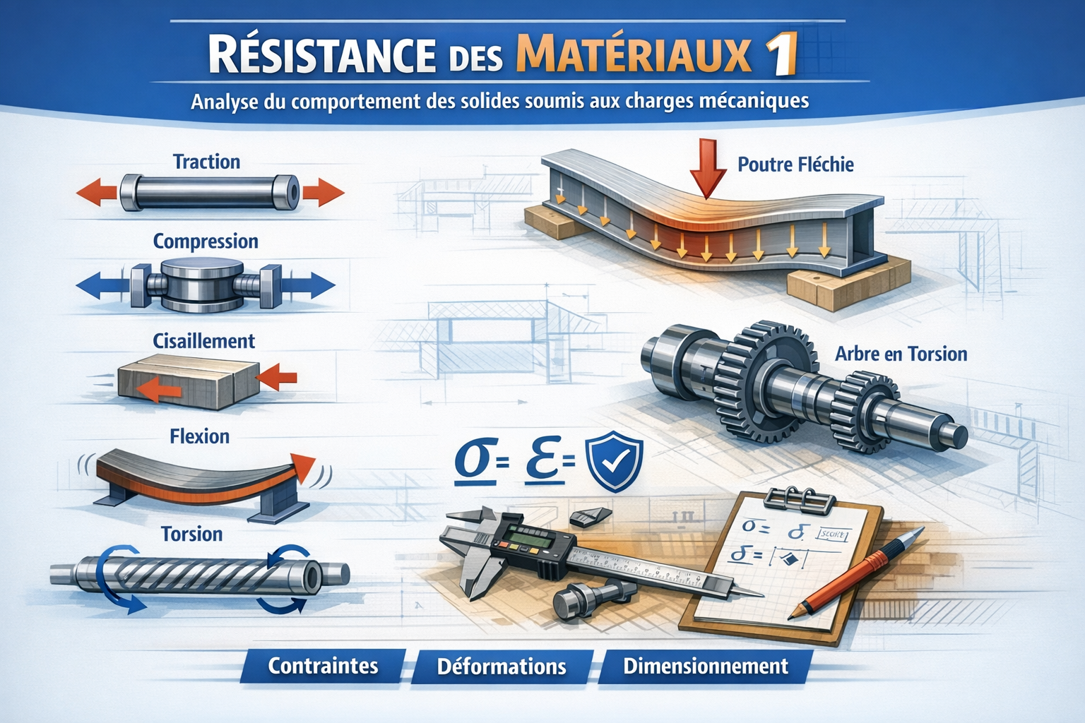 Résistance des matériaux 1 (RDM 1) est une matière fondamentale en génie mécanique qui étudie le comportement des solides soumis à des charges mécaniques. Elle vise à analyser les contraintes, les déformations et les conditions de résistance des structures simples telles que les barres, poutres et arbres. Le cours introduit les notions de traction, compression, cisaillement, flexion et torsion, ainsi que les bases du calcul de dimensionnement des éléments mécaniques en respectant les critères de sécurité.