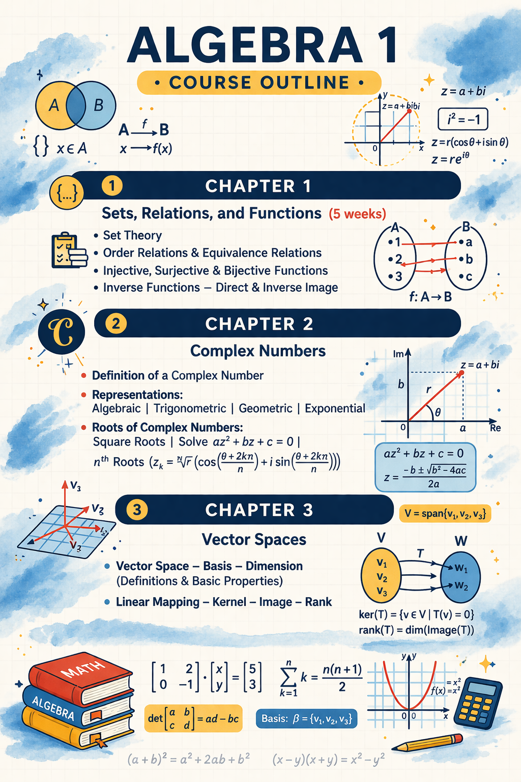 This introductory Algebra 1 course is primarily designed to harmonize students' mathematical background as they enter university. New concepts are introduced gradually, guiding learners step by step toward more advanced mathematical topics. The notions covered in this course are fundamental and rank among the most widely used in the fields of Science and Technology.