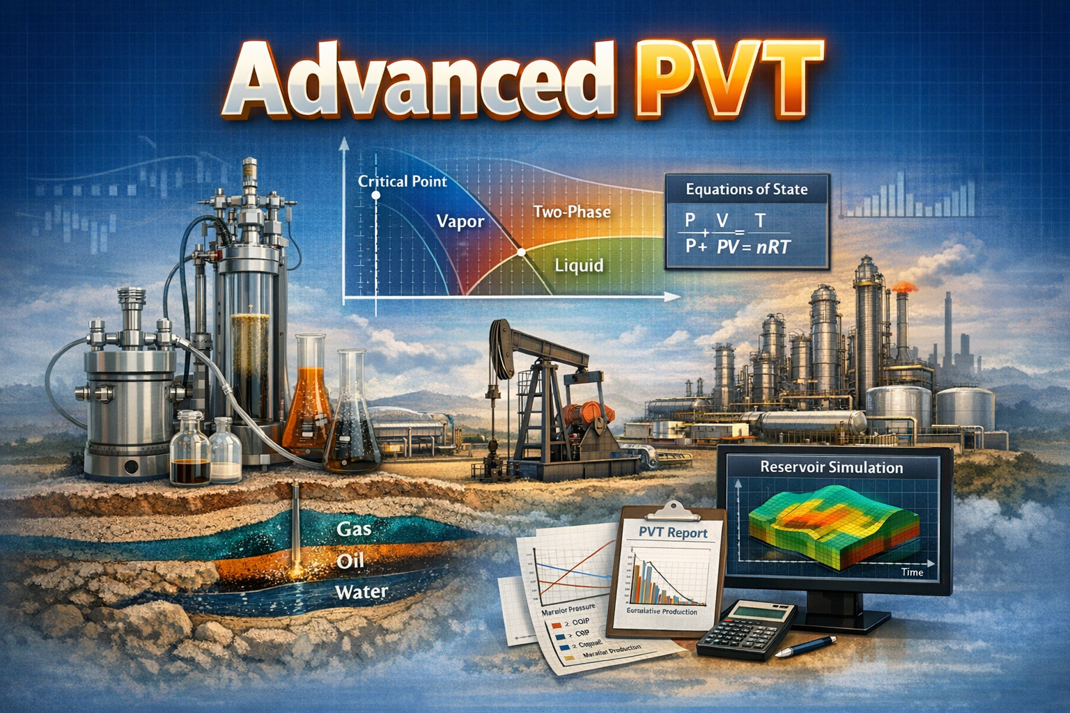 The Advanced PVT module provides an in-depth understanding of the pressure–volume–temperature (PVT) behavior of reservoir fluids and its impact on reservoir engineering and production performance. Building on fundamental PVT concepts, this module focuses on advanced fluid characterization, laboratory PVT analysis, and the application of PVT properties in reservoir studies, well performance, and surface facility design.