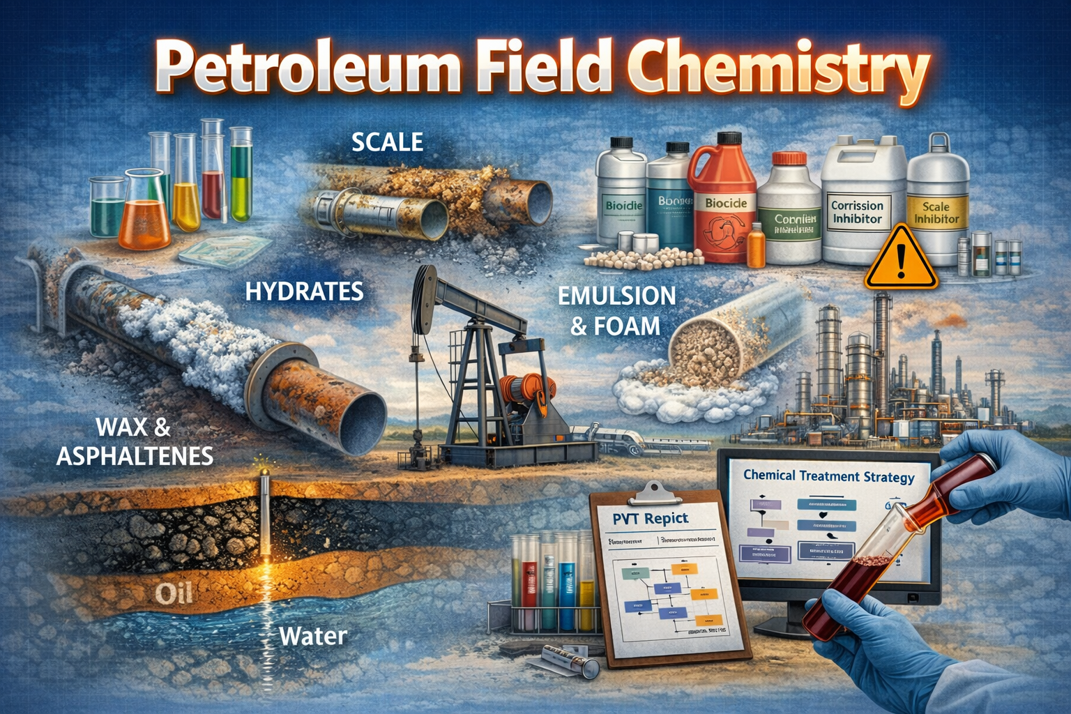 The Petroleum Field Chemistry module focuses on the chemical phenomena encountered during the exploration, production, and processing of hydrocarbons. The course provides a practical and applied understanding of the chemical reactions and interactions occurring between reservoir fluids, rocks, injected chemicals, and production facilities throughout the life cycle of an oil and gas field.