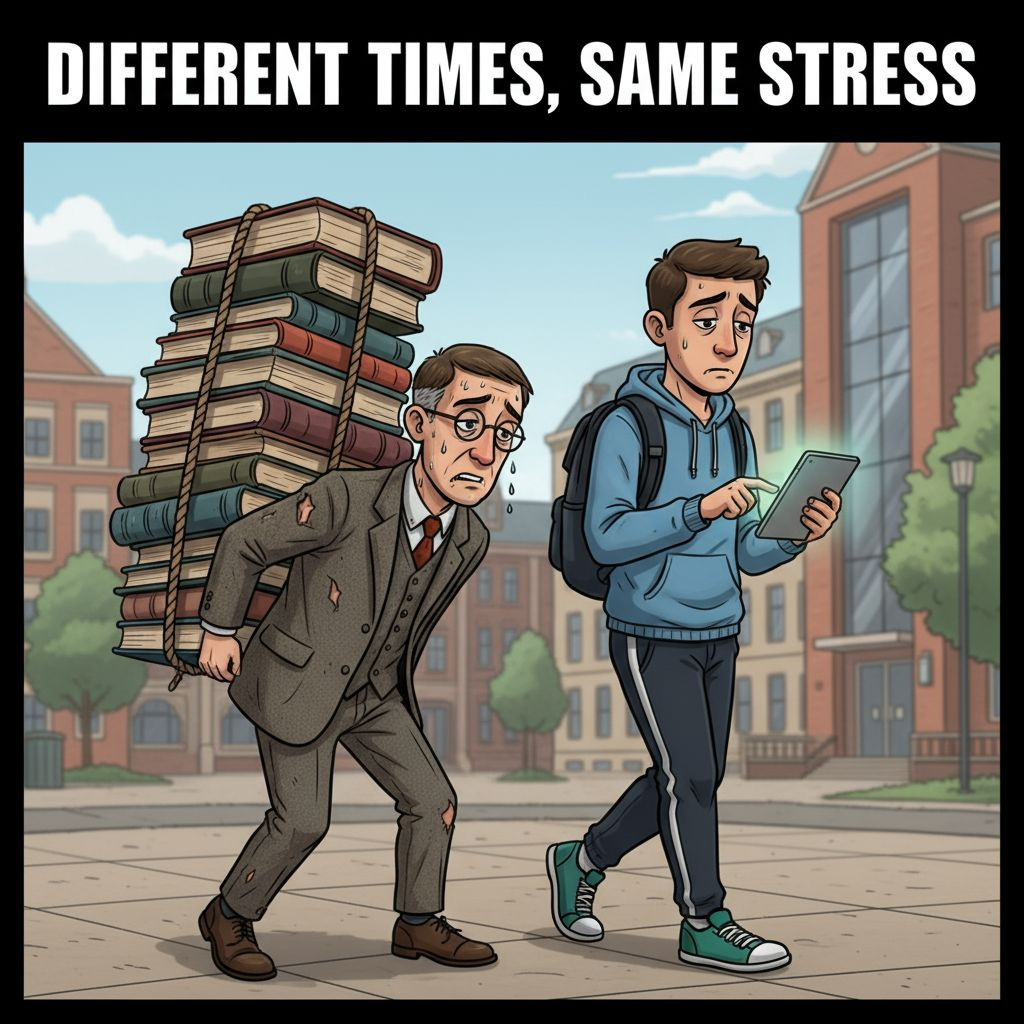 • The caption reads: “Different times, same stress.”