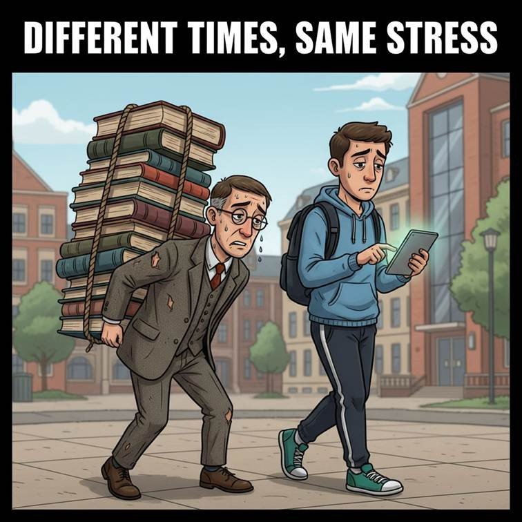 Caricature Title: “Different Times, Same Stress” (students imagine the picture first before being projected to the image.)