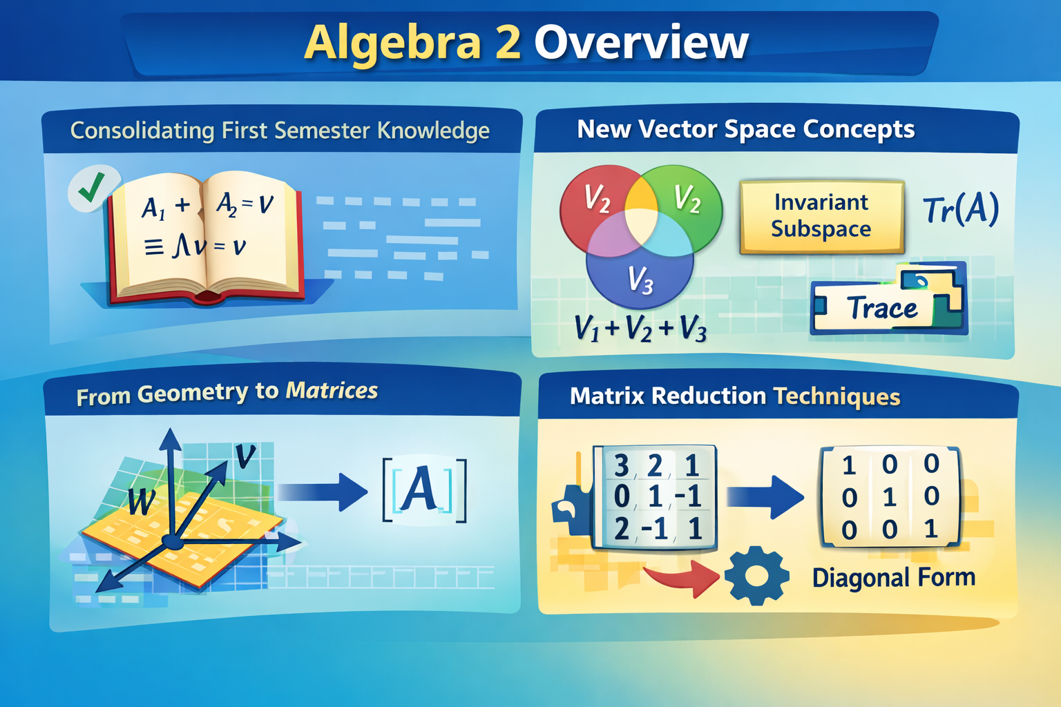 -Study new concepts: the sum of several vector subspaces, invariant subspaces, trace.