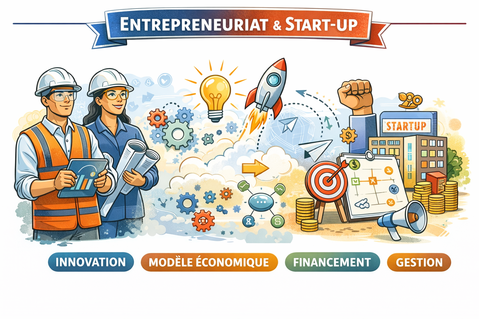 Le cours Entrepreneuriat et Start-up a pour objectif de développer chez les étudiants ingénieurs en mécanique l’esprit entrepreneurial et la capacité à transformer une idée technique ou un projet d’ingénierie en une initiative innovante et économiquement viable.
