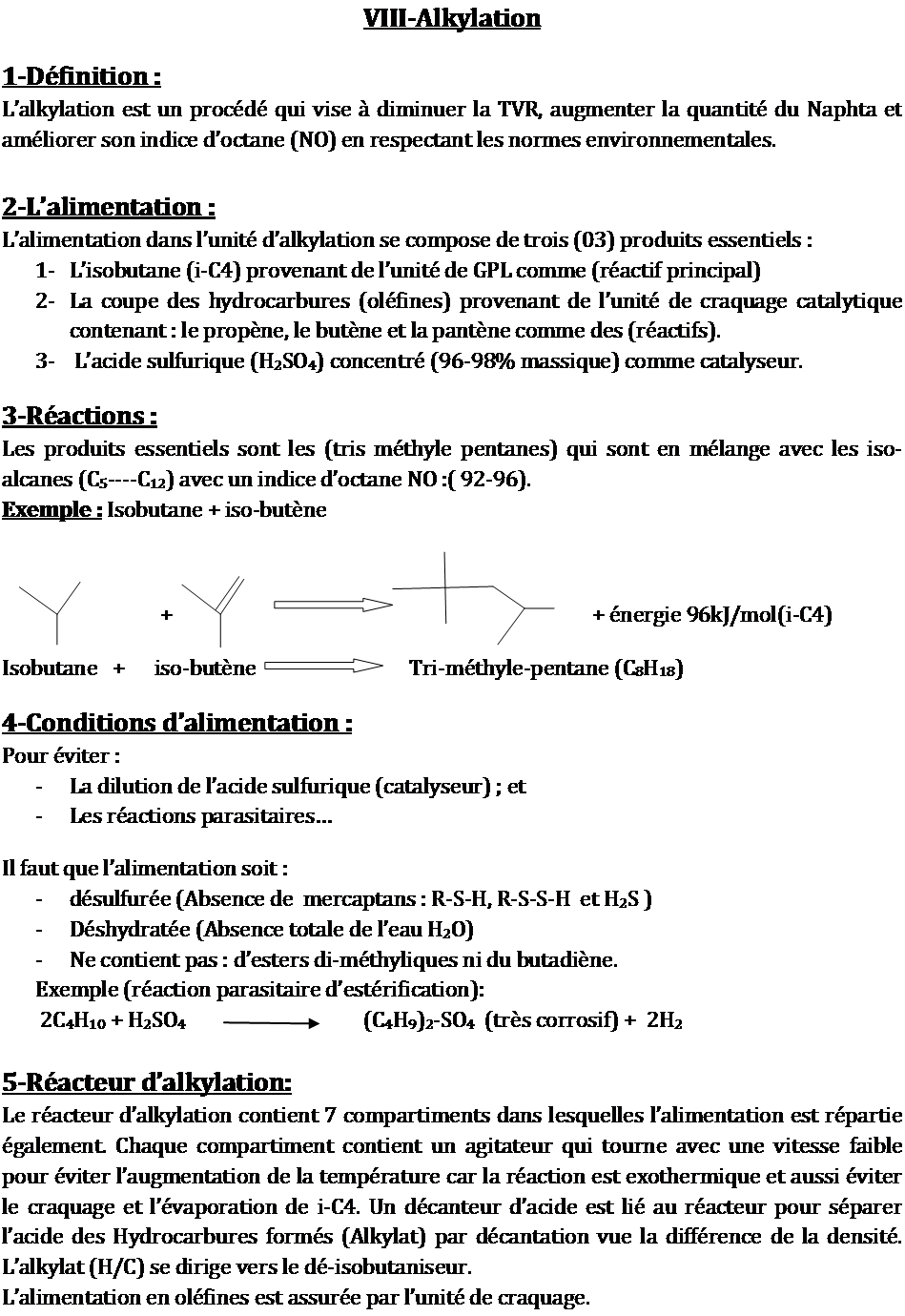 La réaction d’alkylation de l’isobutane avec l’iso-butène pour produire le tri-méthyle-pentane est possible en présence de l’acide sulfurique (96% massique) comme catalyseur.