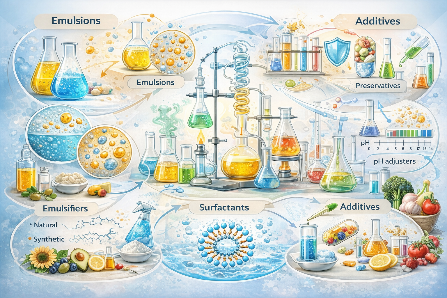 This course introduces the physicochemical foundations of cosmetic and food formulations, with a strong focus on the behavior of surfactants and the formation and stability of emulsions. Students will study amphiphilic molecular structures, classification of surfactants, and key interfacial phenomena at air–liquid, liquid–liquid, and solid–liquid interfaces. The course also covers structure–property relationships, including the influence of alkyl chain length on CMC and the Krafft point, as well as functional properties such as foaming, wetting, detergency, and emulsification. In the second part, learners explore emulsion systems, major instability mechanisms (creaming/sedimentation, flocculation, coalescence, phase inversion, and Ostwald ripening), and stabilization strategies for emulsions and microemulsions. Micellar solubilization, the effects of additives and pH, and key measurement methods are addressed to support formulation design and optimization in real applications.
