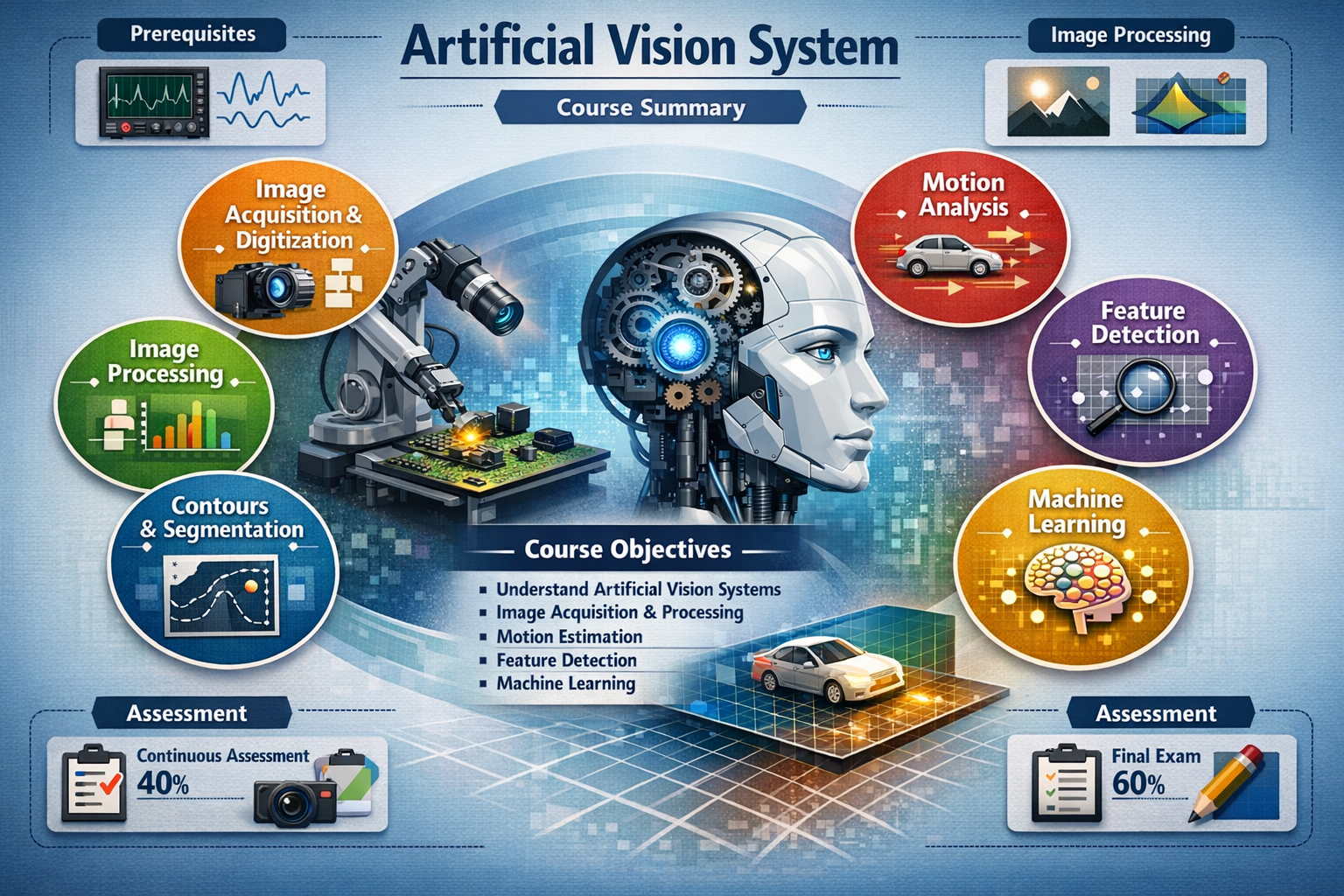 This course introduces the fundamental concepts, techniques, and tools used in artificial vision systems. It aims to provide students with a comprehensive understanding of how machines can automatically reproduce tasks performed by the human visual system and interpreted by the brain.